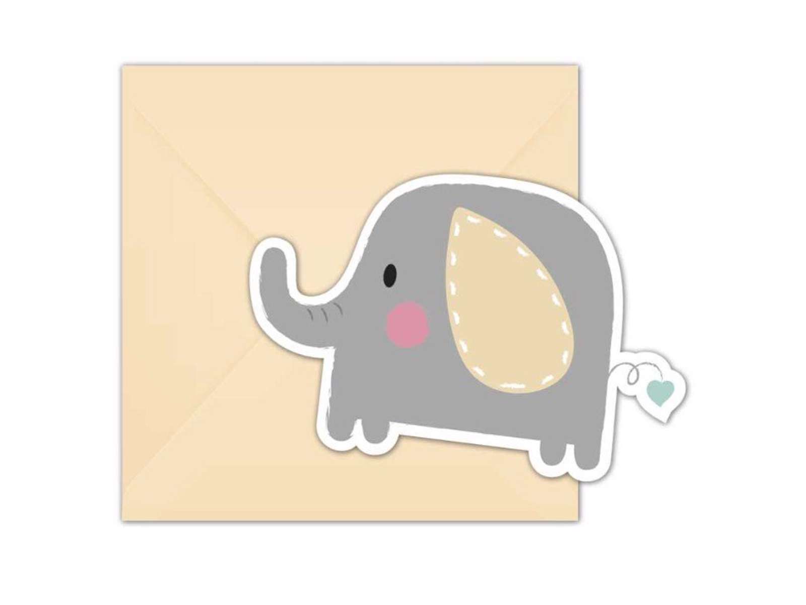 Søde invitationskort med Baby elefant motiv. Vær sikker på at dine venner kommer til festen og send dem en sød invitation. Der er 6 stk i en pakke og kommer med kuverter.