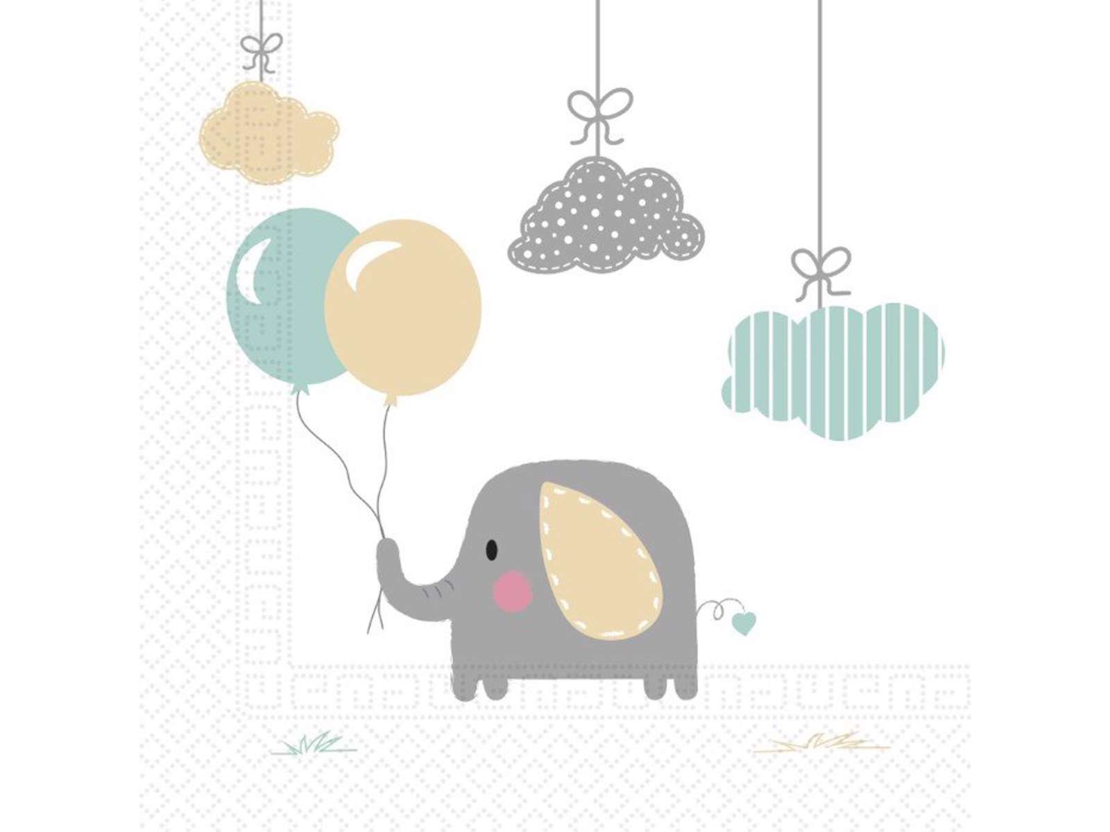 Søde servietter med Baby elefant motiv. Der er 20 stk i en pakke og de måler 16 x 16 cm.