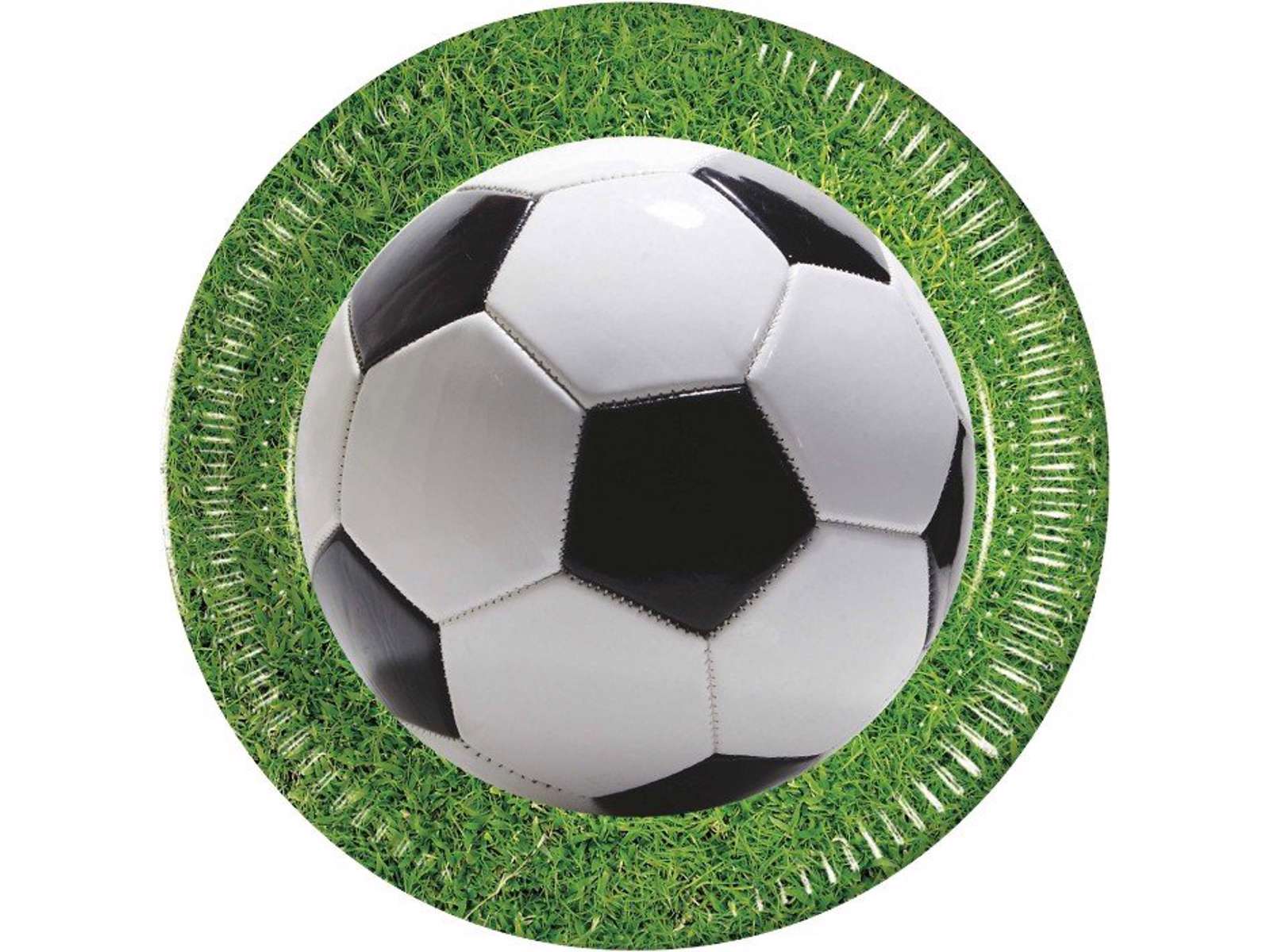 Seje tallerkner i pap med en fodbold på en græsplæne som motiv. De måler 22 cm og der er 8 stk i en pakke.