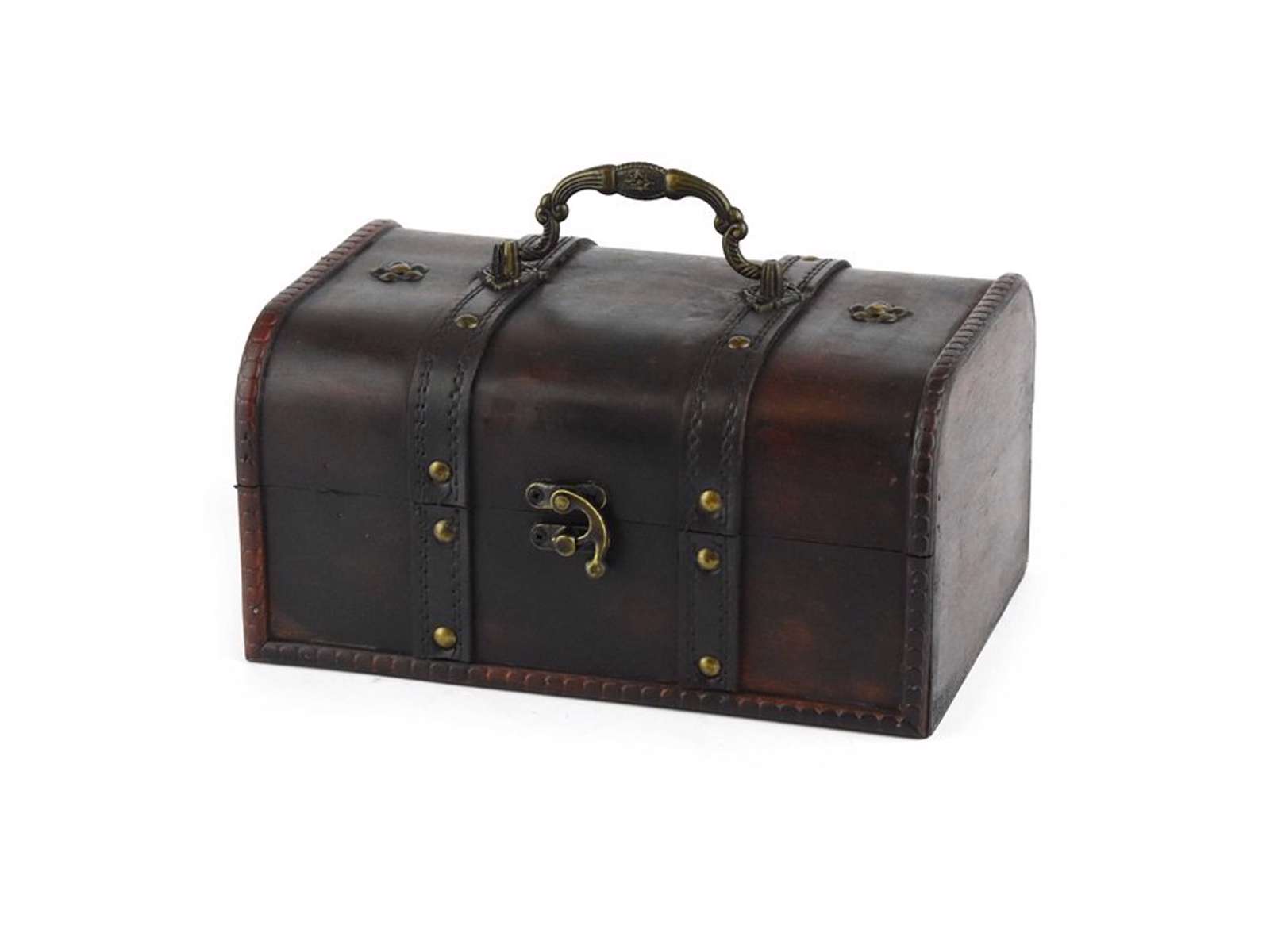 Fin skattekiste af træ, med metalspænde og pynte læderremme. Kisten måler 24 x 16 x 12 cm. (Højde, dybde, bredde)