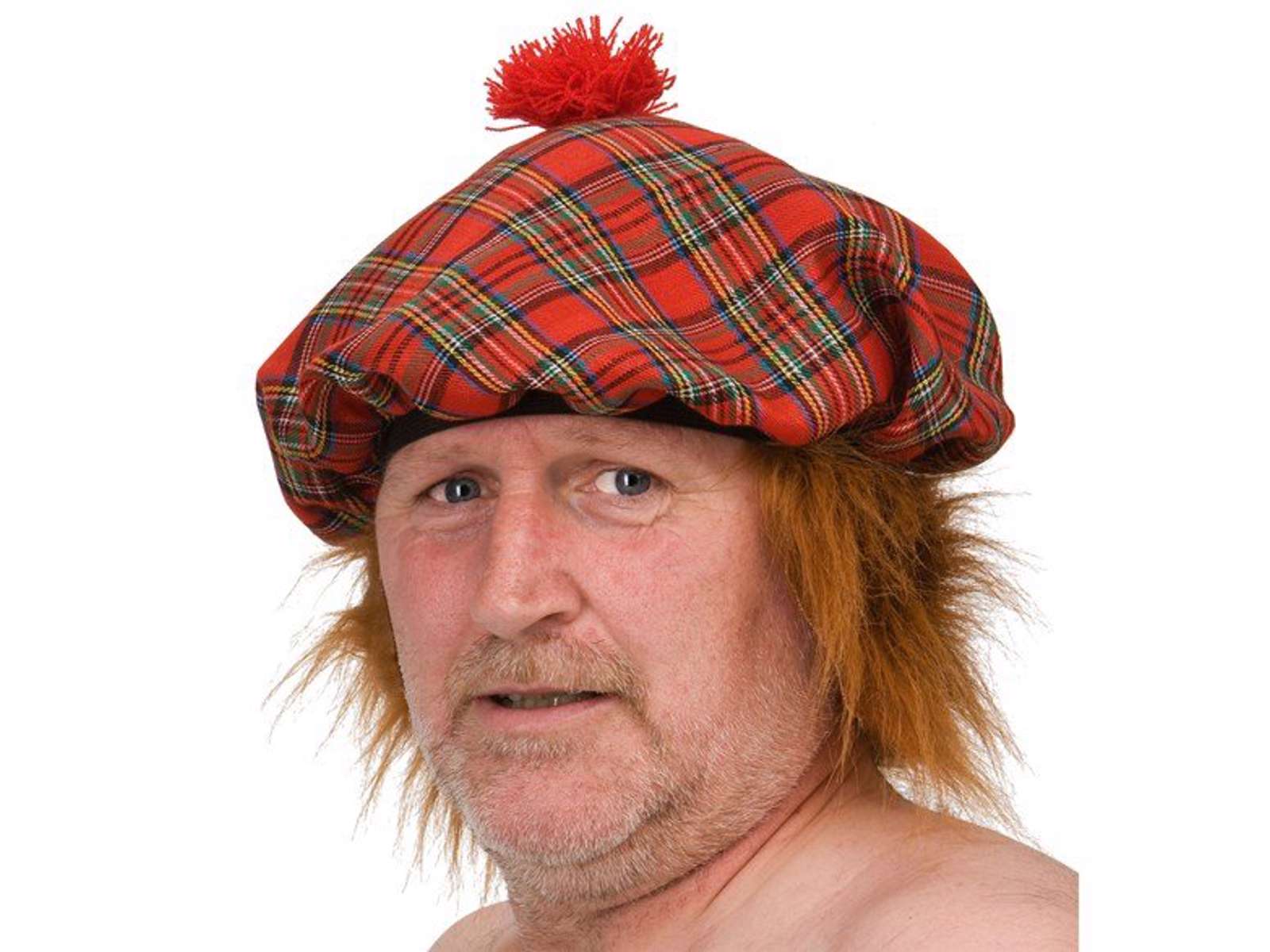 Sjov skotsternet hue med påsyet håt.