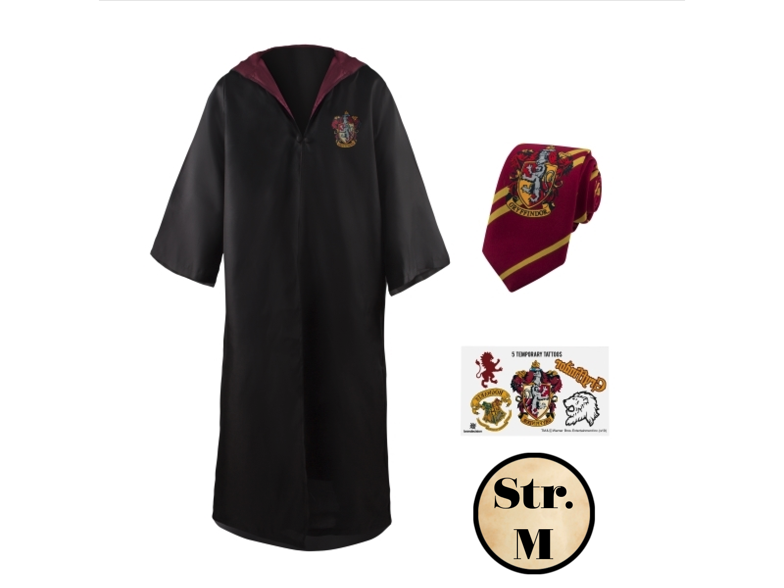 Her får du en flot Gryffindor kappe, et slips og et ark tatoveringer.