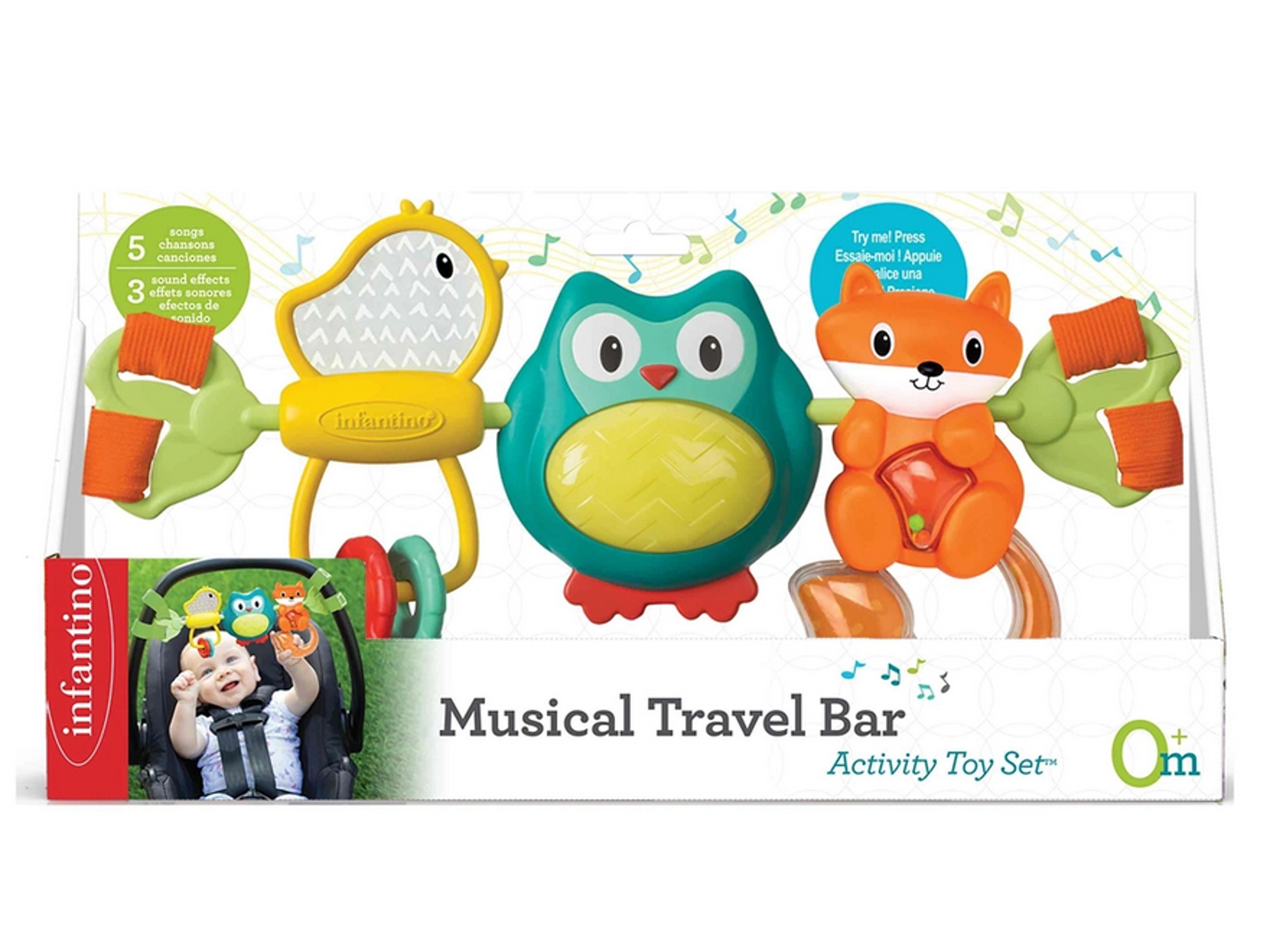 Sød aktiverings legetøj til de små krudtugler som er med på farten. Dyrene har behagelige afdæmpede farver og indeholder rangle, har forskellige føleoplevelser og et spejl.