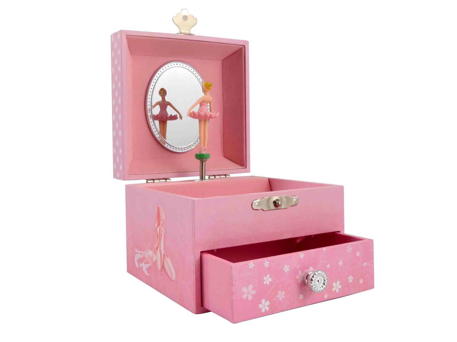 Smykkeskrinet fra Magni har indbygget spilledåse, som kan trækkes op, og når man åbner låget spiller den en fin melodi, mens den lille balletdanserinde drejer rundt foran spejlet. Smykkeskrinet har et stort rum samt en skuffe forneden.