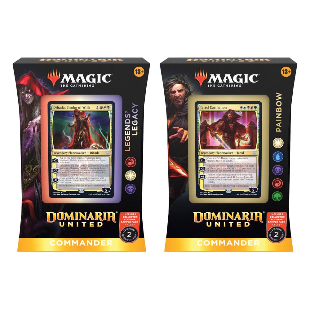 The Dominaria United Commander Decks includes 1 ready-to-play deck of 100 Magic cards (2 traditional foil legendary cards, 98 nonfoil cards), a 2-card Collector Booster Sample Pack, 1 foil-etched Display Commander (a thick cardstock copy of the commander card with foil etched into the card's border and art), 10 double-sided tokens, 1 deck box (can hold 100 sleeved cards), 1 Life Wheel, 1 strategy insert, and 1 reference card.