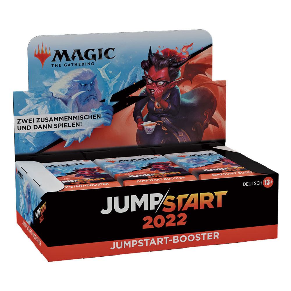 The Jumpstart 2022 Booster Box contains 24 Magic: The Gathering Jumpstart Boosters. Each Jumpstart 2022 Booster contains 1 insert indicating the pack's theme and 20 Magic cards revolving around that theme, including 1 card with anime-inspired art, a total of 1–2 cards of rarity Rare or higher, and all the lands you need to play. To play with even more wild theme combos, Jumpstart 2022 Boosters can be combined with packs from any other Jumpstart product.