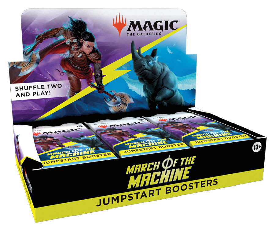 The March of the Machine Jumpstart Booster Box contains 18 March of the Machine Jumpstart Boosters. Each booster has a theme. Just grab two packs and shuffle them together for wild combos and a unique gameplay experience that's great for a quick game, for long-time fans looking to jump back in, or for a fun, approachable way to learn the game. March of the Machine Jumpstart Boosters contain 20 Magic cards (including all the lands you need to play). In every pack, you'll find 2 Rare cards (1 Rare card designed for Jumpstart boosters and 1 Rare or Mythic Rare from the main set), and 2 Land cards with a shining Traditional Foil treatment. If you're looking to maximize your mashups, March of the Machine Jumpstart Boosters can be combined with packs from any other Jumpstart product. Contents: - 18 March of the Machine Jumpstart Boosters-20 MTG cards per booster - 2 Traditional Foil Land cards in every pack - 2 Rare cards in every pack-1 Rare or Mythic Rare 1 Rare card designed for Jumpstart boosters - Each pack has 1 of 5 possible themes and each theme comes in 2 variants-mix and match to save the Multiverse - Just grab 2 Jumpstart packs, shuffle, and you're ready to rumble