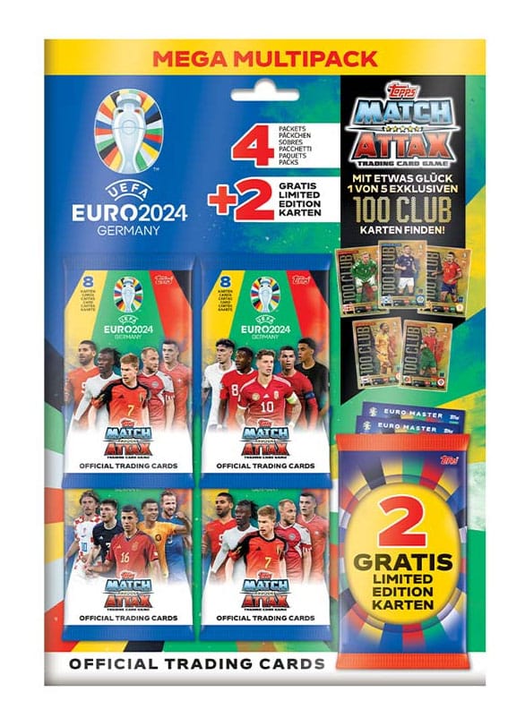 The Eco Mega Multipack contains 32 EURO 2024 Match Attax cards (4 packets) plus 2 random Euro Master Limited Edition cards.