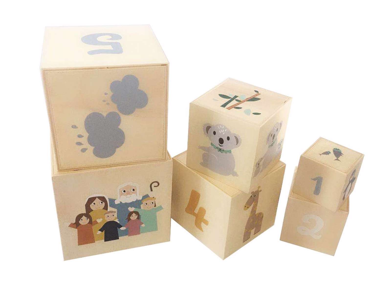 Magni stabel lavet i træ. Siderne er dekoreret med tal, billeder af dyr eller andre figurer. Kan hjælpe barnets ko-ordinationsevne når man stabler kasserne.