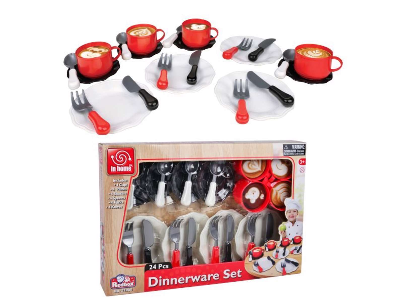 Her får du service til 4 personer. Der er både tallerkener, knive, gafler, kopper, underkopper og skeer. I alt 24 dele. Anbefalet alder fra 3 år.