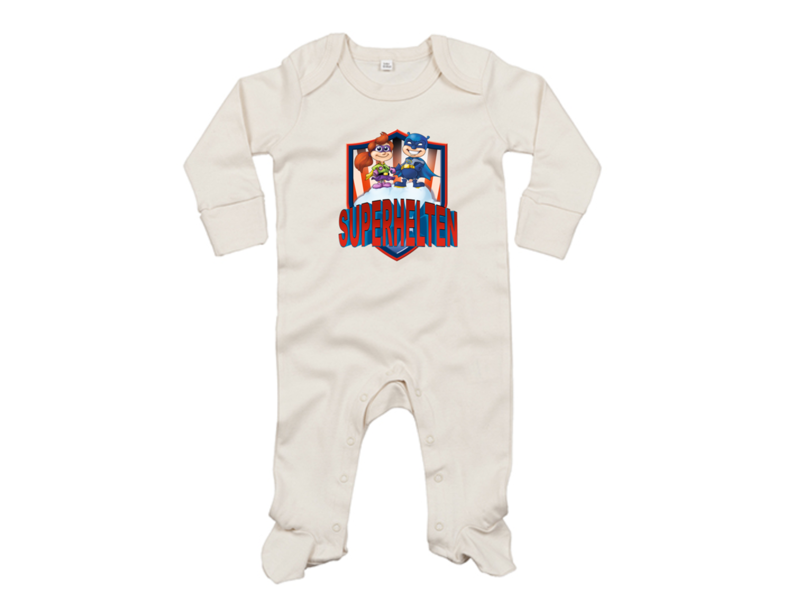 Heldragt til din lille superhelt, i blød Fair trade og Oekotex certificeret bomuld. Dragten har et Suprhelten logo våbenskjold på maven, og åbnes med nikkelfrie trykknapper i bunden.