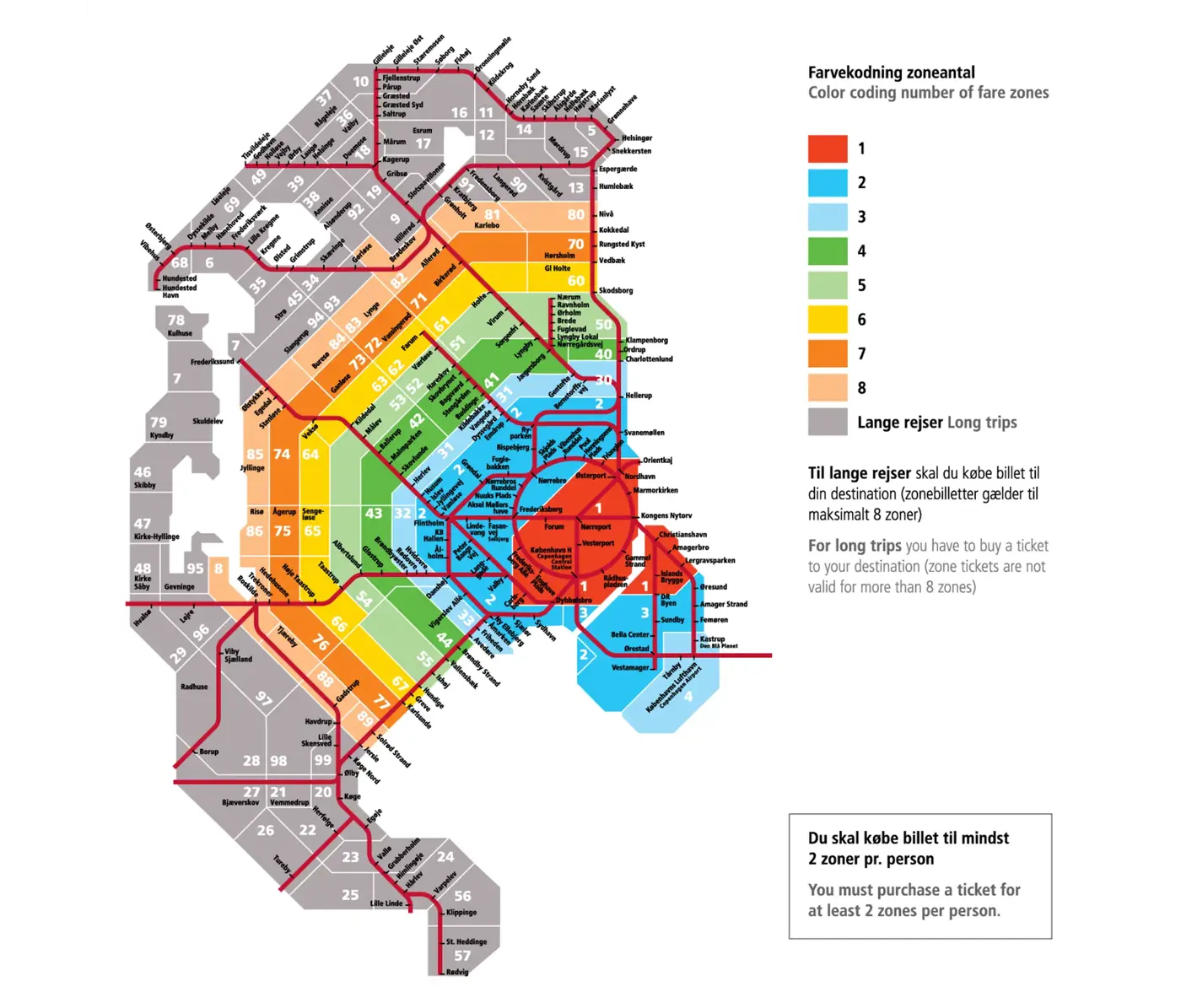 Copenhagen is divided into fare zones, with zones 1–3 forming the city core where most visitors spend their time.