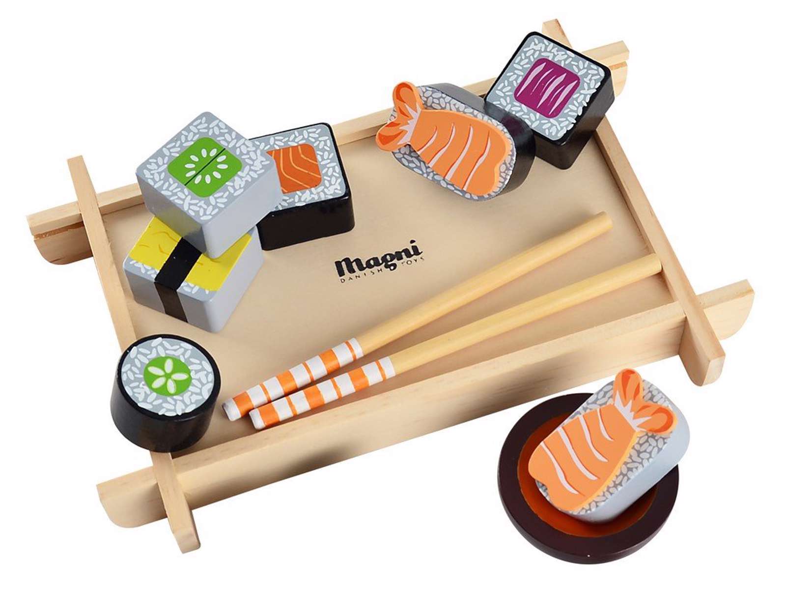 Herligt sæt med sushi legemad i træ til børn som elsker at lege kok eller restaurant.