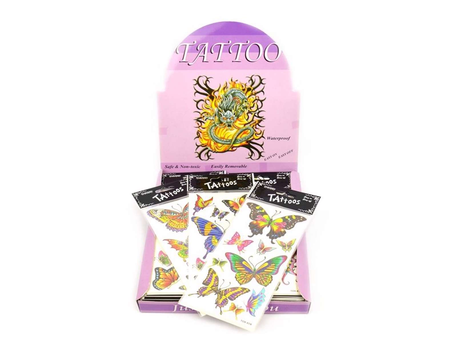 Pakke med flotte og seje tatoveringer med sommerfugle. Kommer i flere forskellige farver. Prisen er for 1 pakke.