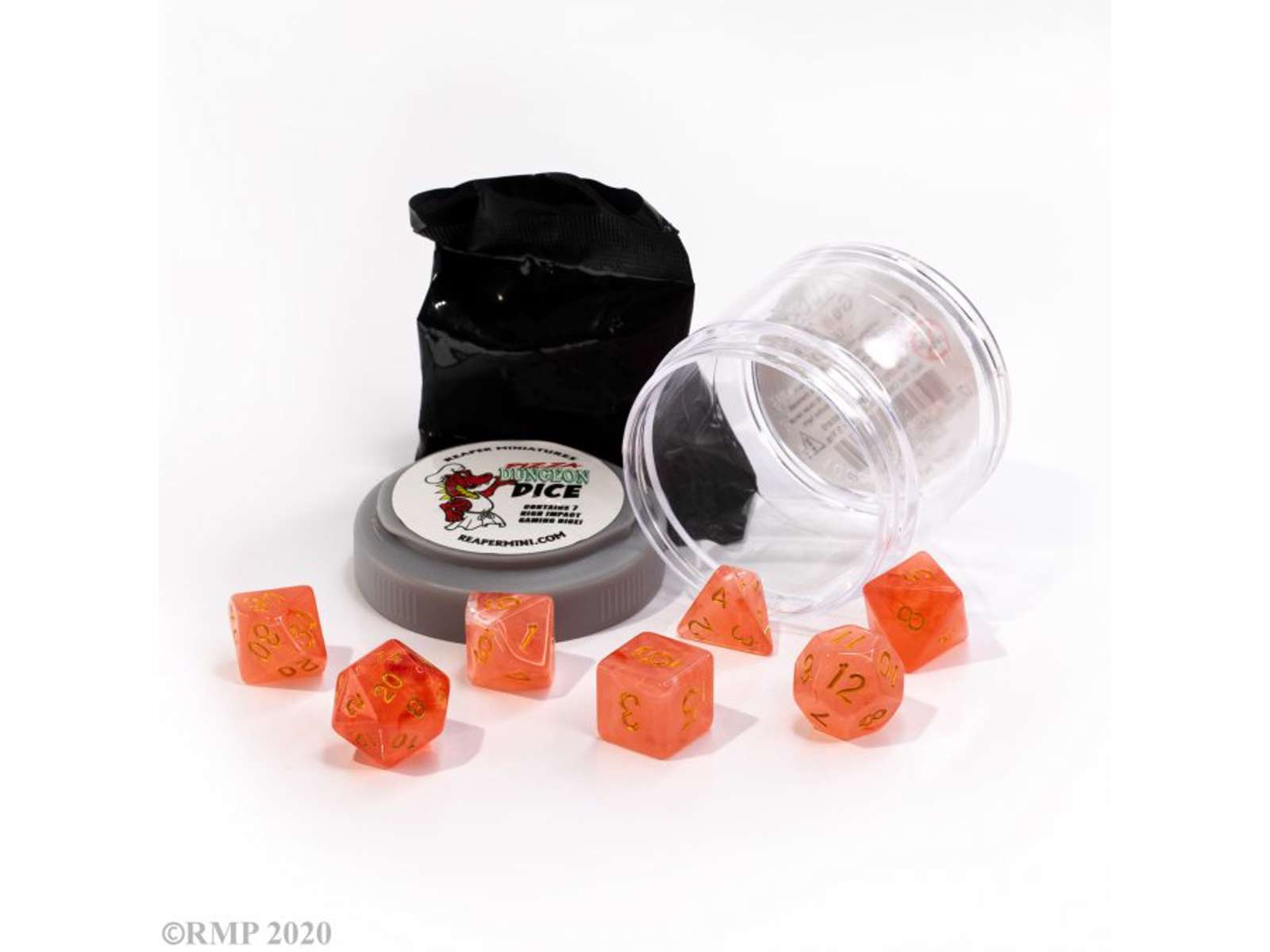 Syv terninger til bordrollespil, i en klar plastbøtte. Her får du et stilrent og lækkert terningsæt, som indeholder: