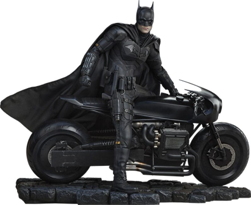 "Two years of nights have turned me into a nocturnal animal." Sideshow presents The Batman Premium Format™ Figure, a striking DC Comics collectible bringing both hope and vengeance to your display. The Batman Premium Format Figure measures 19" tall and 22" wide as Batman, balanced with one foot on the rain-soaked black pavement, dismounts a sleek motorcycle which features functioning head and tail lights. Based on designs from The Batman, this fully realized black Batcycle stands steady and sturdy on two massive wheels beneath Batman. The hero's mouth is set in its signature scowl, while his coiled body braces for the oncoming storm - whether it be a brutal battle or an emotional farewell. Inspired by Robert Pattinson's portrayal of the Dark Knight in The Batman (2022) directed by Matt Reeves, The Batman Premium Format Figure was created utilizing extensive reference material from Warner Bros. and thus evokes all of the drama and intrigue present throughout the film. From Batman's cowl to his utility belt and boots, the fully sculpted, film-accurate Batsuit depicts the character's commitment to fighting crime in Gotham City in meticulous, realistic detail. This comprehensive mixed media collectible also includes a tailored, wired fabric cape, allowing you to recreate the dynamic movement of an intense motorcycle chase scene. Fans of The Batman won't want to miss their chance to make this ultimate tribute a centerpiece in their DC Comics collection. Embrace the night and bring home The Batman Premium Format Figure today! *Requires three AA batteries to power illumination. Batteries not included. Product Size: 48 x 56 x 30 cm