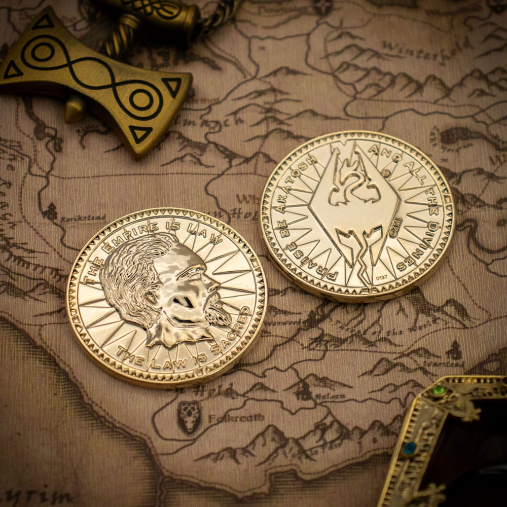 The empire is law, the law is sacred! Pay your way in Tamriel with this limited edition replica septim 24k gold plated coin. Measuring 38 mm in diameter this coin is limited worldwide to 2011 (year of game release) with each being individually numbered. As well as having the distinguishable 24k gold plating, this collectible is supplied in a protective acrylic cup to preserve its condition.
