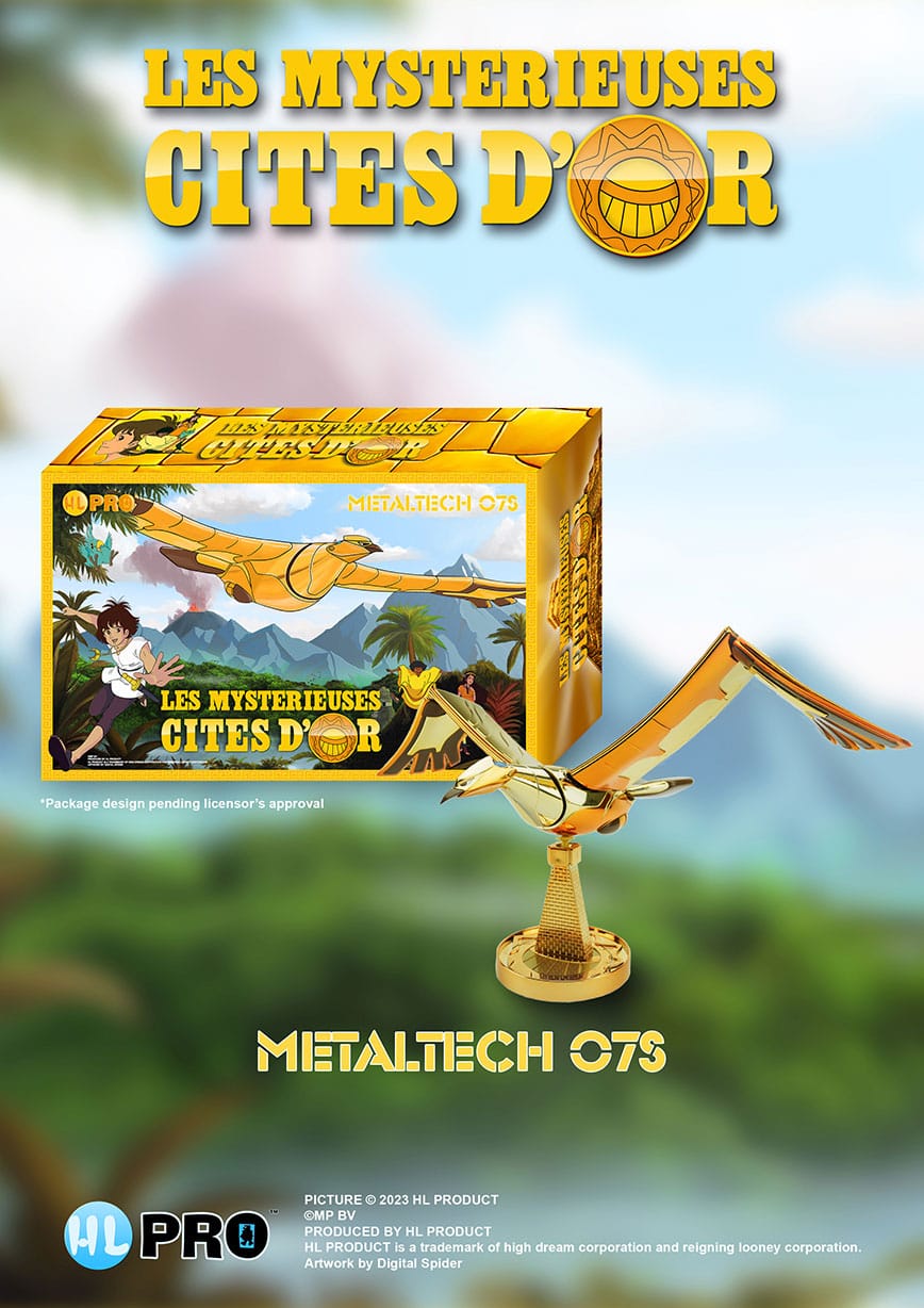 Reproduction of the popular die cast metaltech 07 GOLDEN CONDOR vehicle with a new paint application, chrome gold, from the 1982 TV anime series, The mysterious cities of gold.