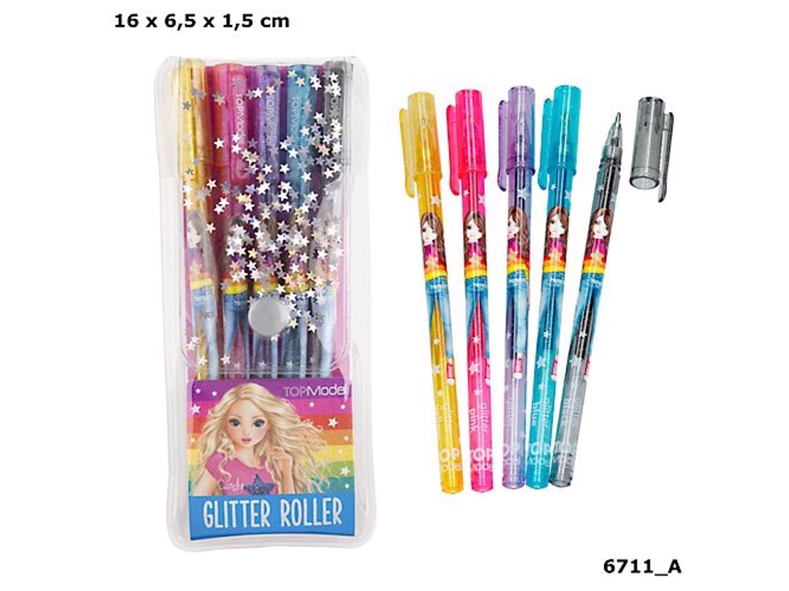 Pakke med 5 fine glimmer gelpenne. Perfekte til at bruge sammen med Top Model malebøgerne.