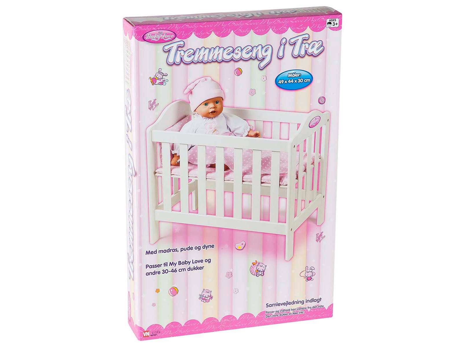 Tremmeseng i træ til dukker. Måler 49x44x30cm og kommer med madras, pude og dyne. Passer til 30-46cm dukker.