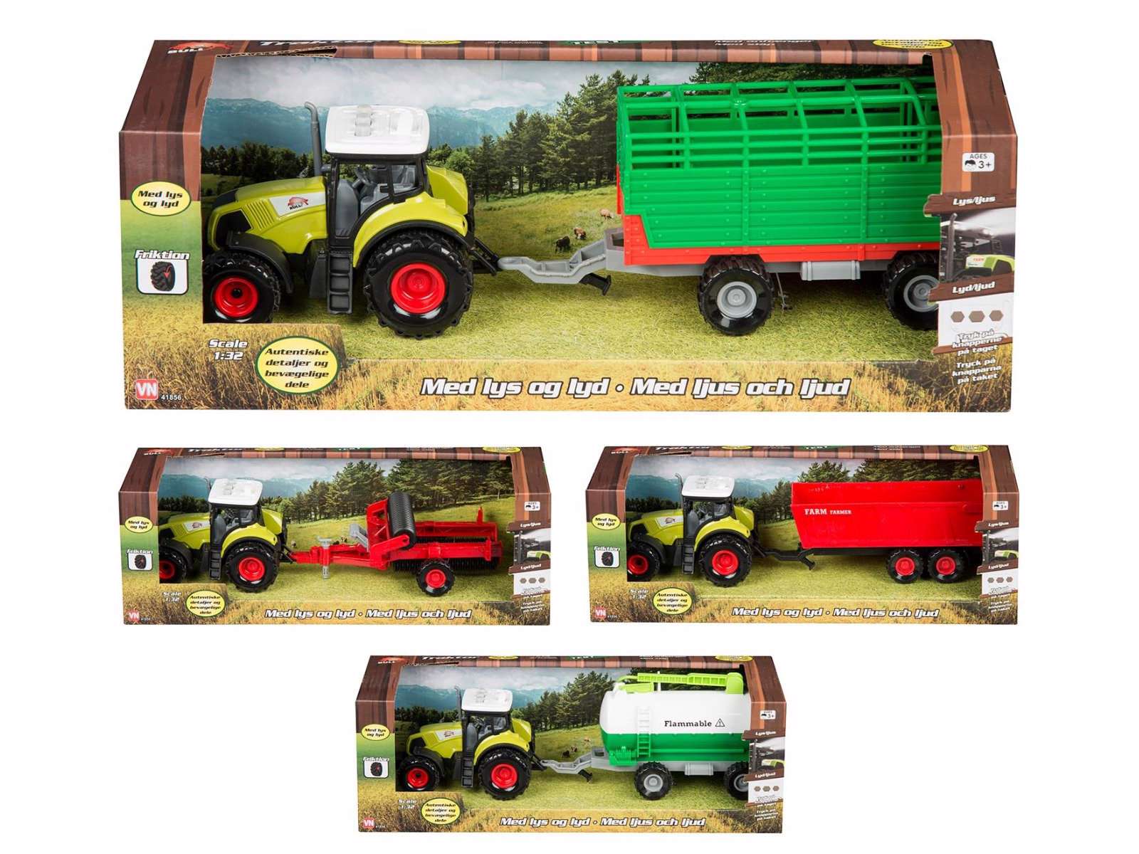 Traktoren har fine detaljer, i blandt andet førerhuset, og på anhængeren helt ned til hjulene, samt lys, lyd og hjul med friktion!