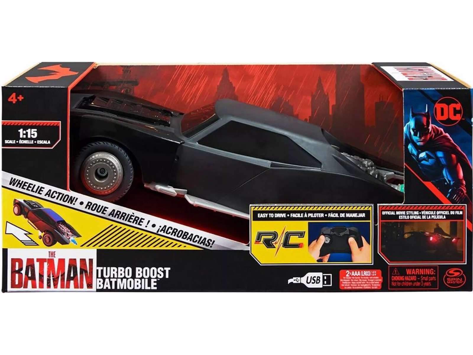 Batmobile Turbo-boost har et ekstra hjul, under karosseriet, der lader dig lave episke stunts på baghjulene. Bilen er i sort, dæmpet lak, præcis som i filmen. Denne RC bil tager dig med ind i kampen, når du skal kæmpe mod skurke i Gotham City. Bilen kører fremad og bagud, og du kan styr til venstre og højre med den brugervenlige fjernbetjening, helt perfekt til nybegyndere.