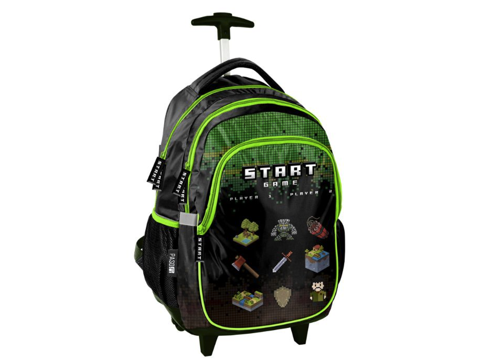 Lækker sort/grøn rygsæk og trolley i én! Modellen hedder ‘GAME’ og har Minecraft-inspirerede detaljer og motiver på fronten.