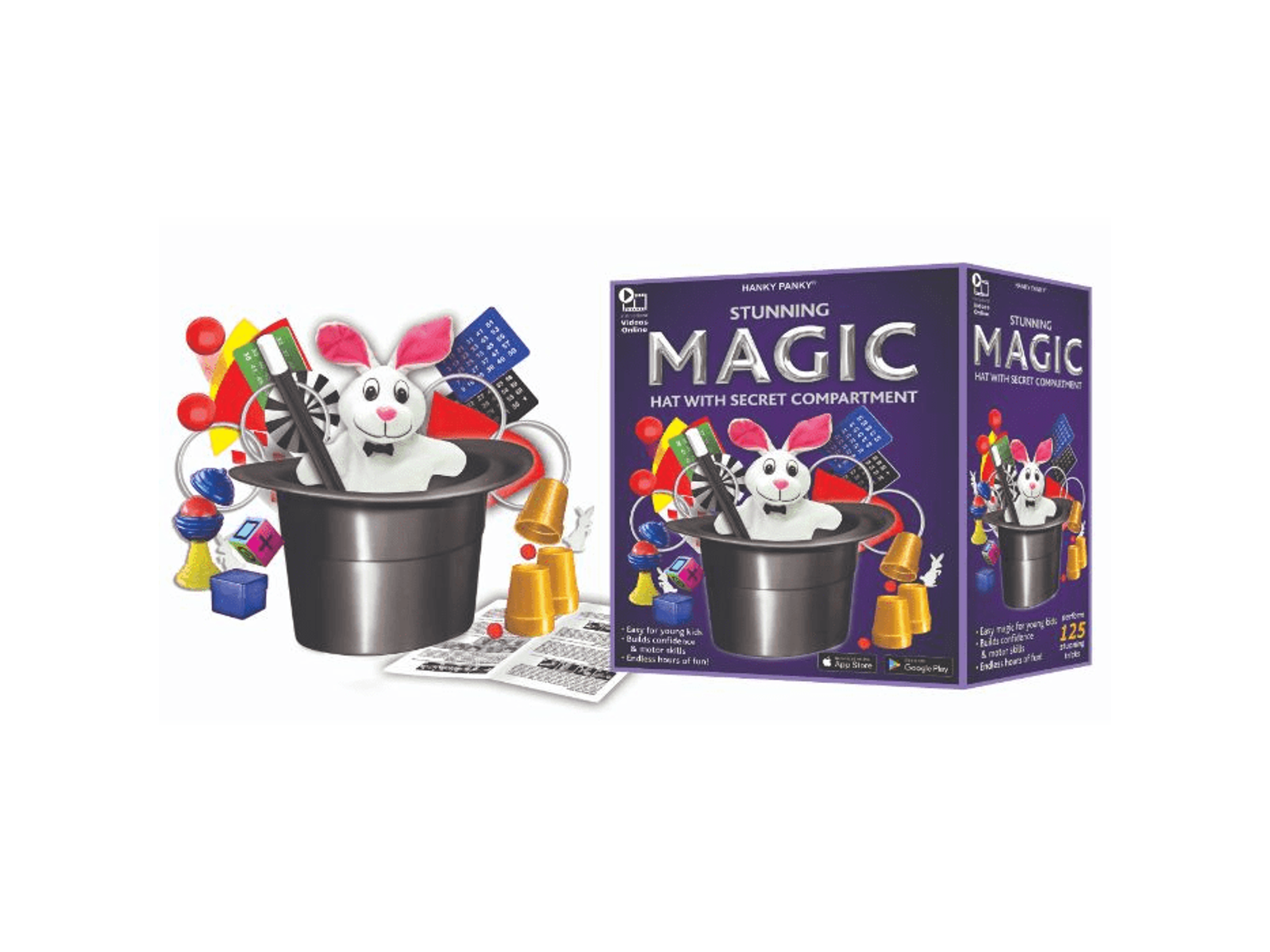 Kommer med tryllehat med hemmeligt rum, kanin og tyllestav.