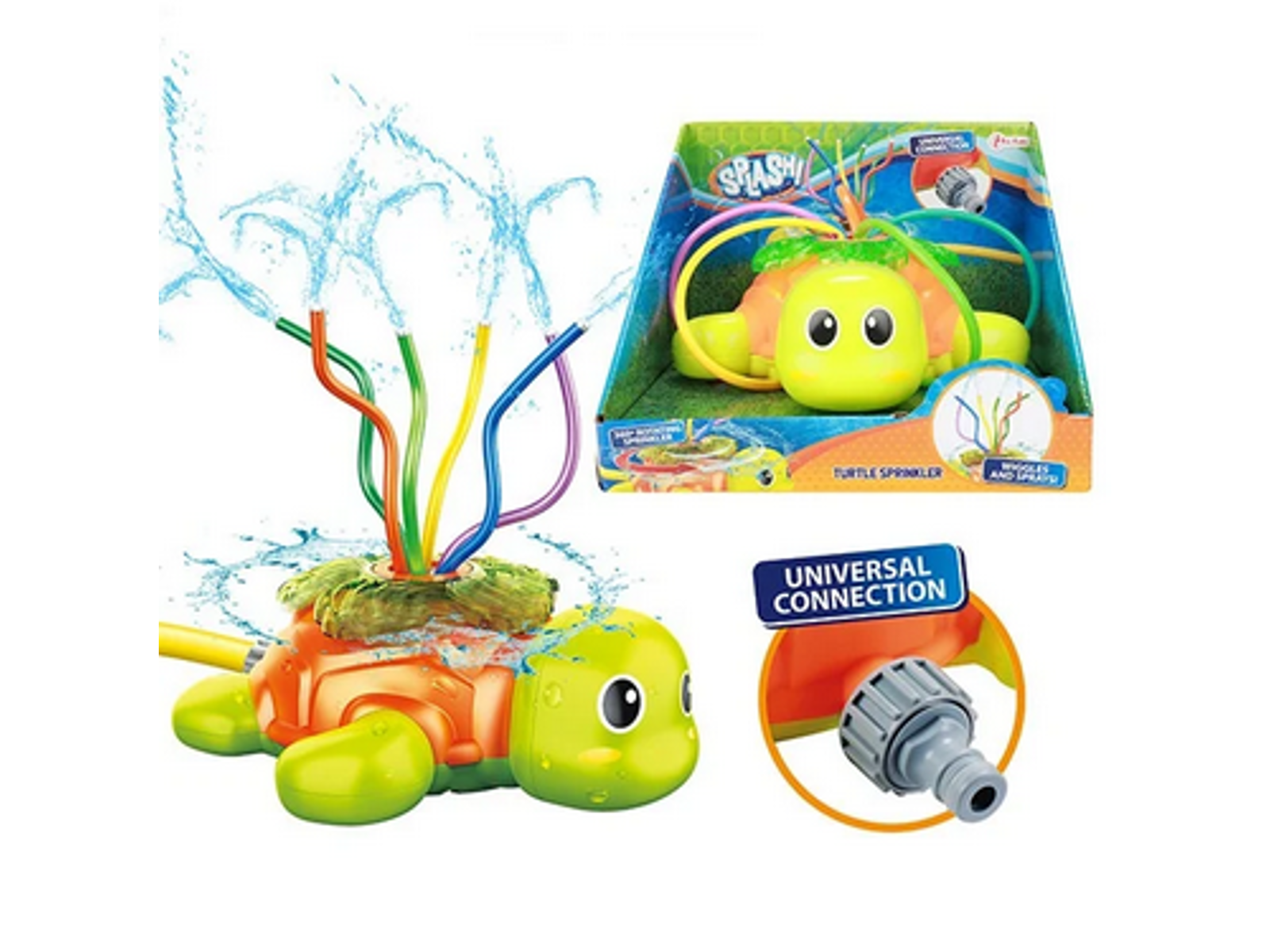 En sjov skildepade springer til den varme sommer, som sprøjter vand alle vegne når den først er tilsluttet en have slange.