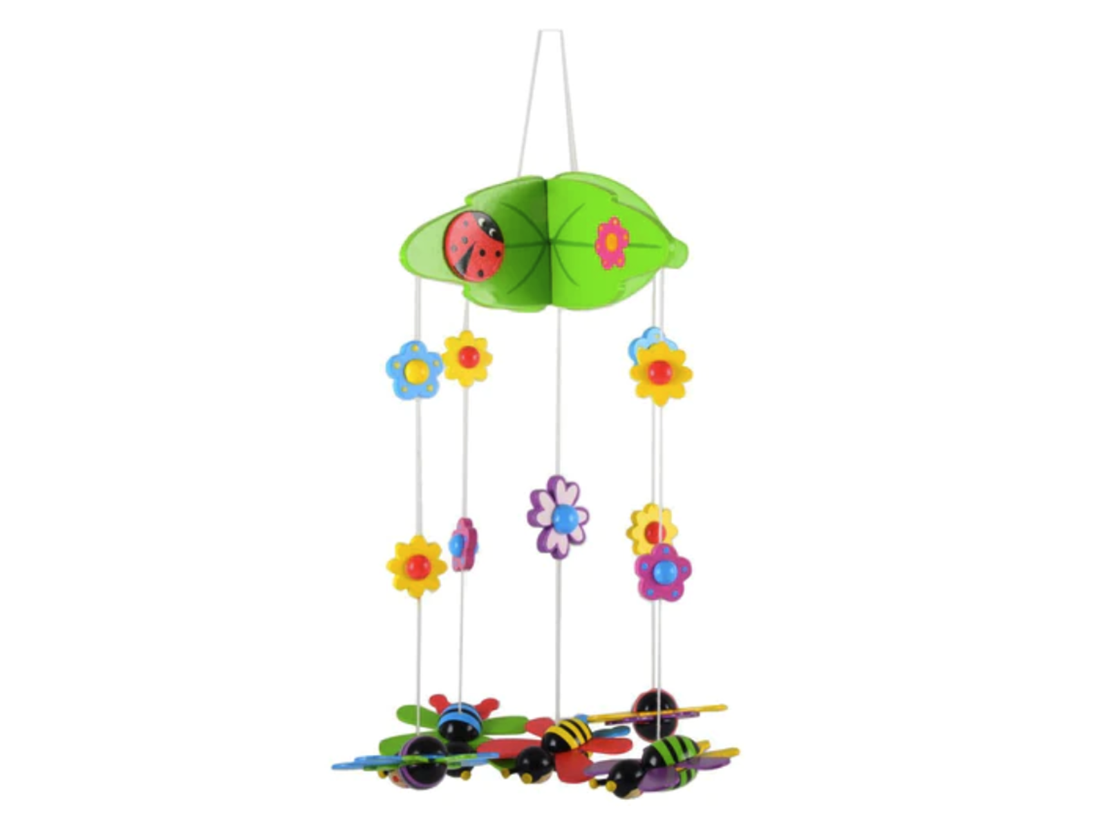 Flot uro i træ fra Magni med blomster-og-bier-tema, som kan hænges ved sengen eller puslebordet, så baby har noget spændende at kigge på. Når dit barn bliver større, kan uroen hænge og pynte på børneværelset, hvor den vil bidrage med genkendelighed og tryghed.