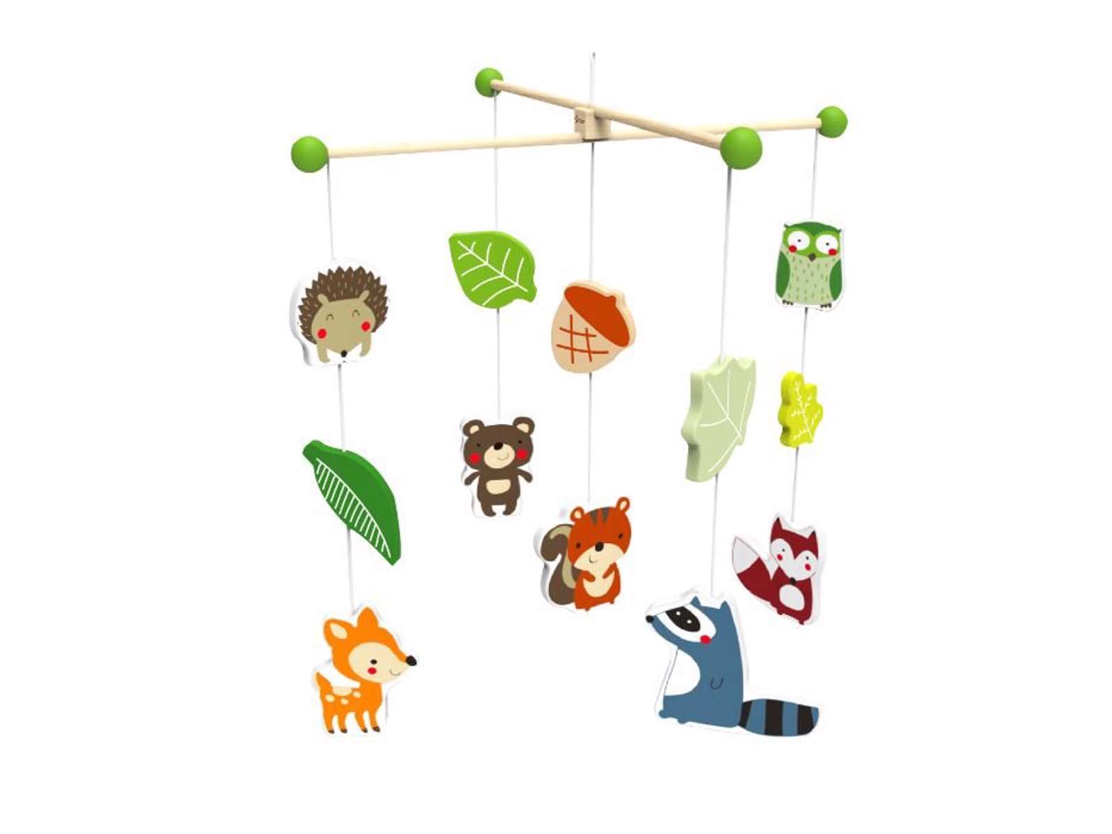 Sød uro med skovens dyr, til at hænge over babys seng. Den er fremstillet i FSC-træ og måler 35 x 35 cm.