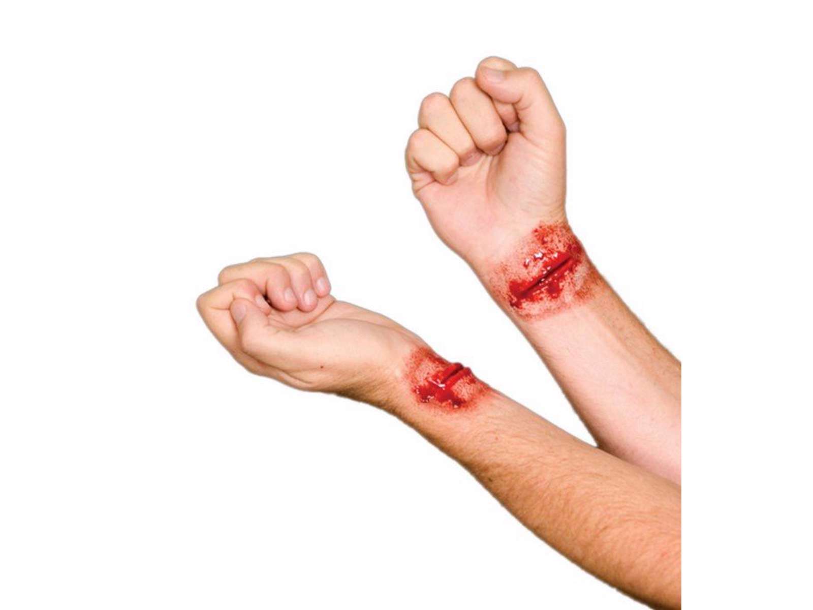 Designet til at ligne uhyggeligt dybe håndleds sår. Sættes på med hudlim på hele området og sidste finnish er masser af teaterblod. Hudlim og blod købes separate.