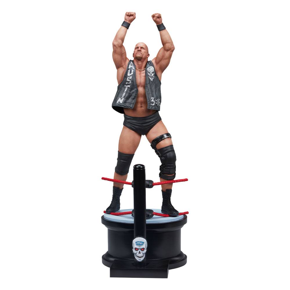 The Stone Cold Steve Austin Statue measures 27.5" tall, pumping his fists high in the air. With an incredibly detailed physique and expertly crafted likeness of the Texas Rattlesnake himself, this statue captures all the attitude and intensity he is famous for. The pro wrestler stands on a circular podium base with a black post featuring Steve Austin's signature skull logo as well as sculpted turnbuckles and rope to create the full immersive look of the WWE ring in collectible format.