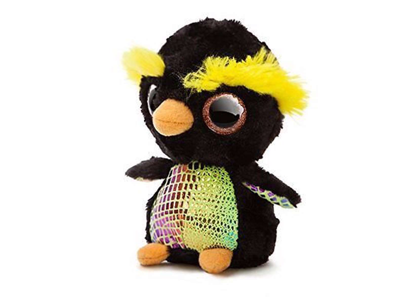 Den måler 12,5 cm og har flot glimmerstof på maven og armene og store buskede øjenbryn.