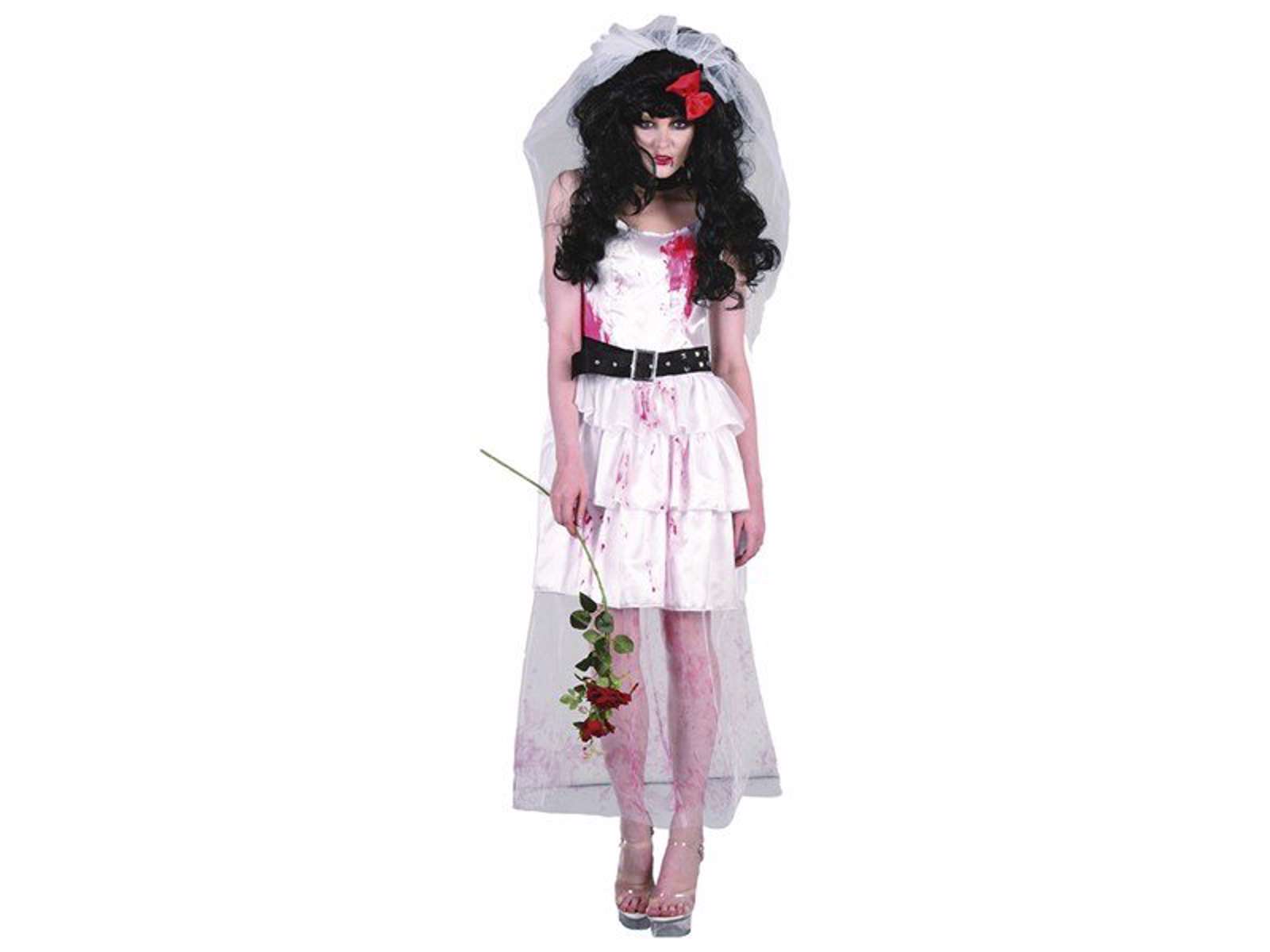 Zombie brud kostume fra Joker Onesize voksen. Kommer med kjole, bælte, halsbånd og hovedbeklædning.